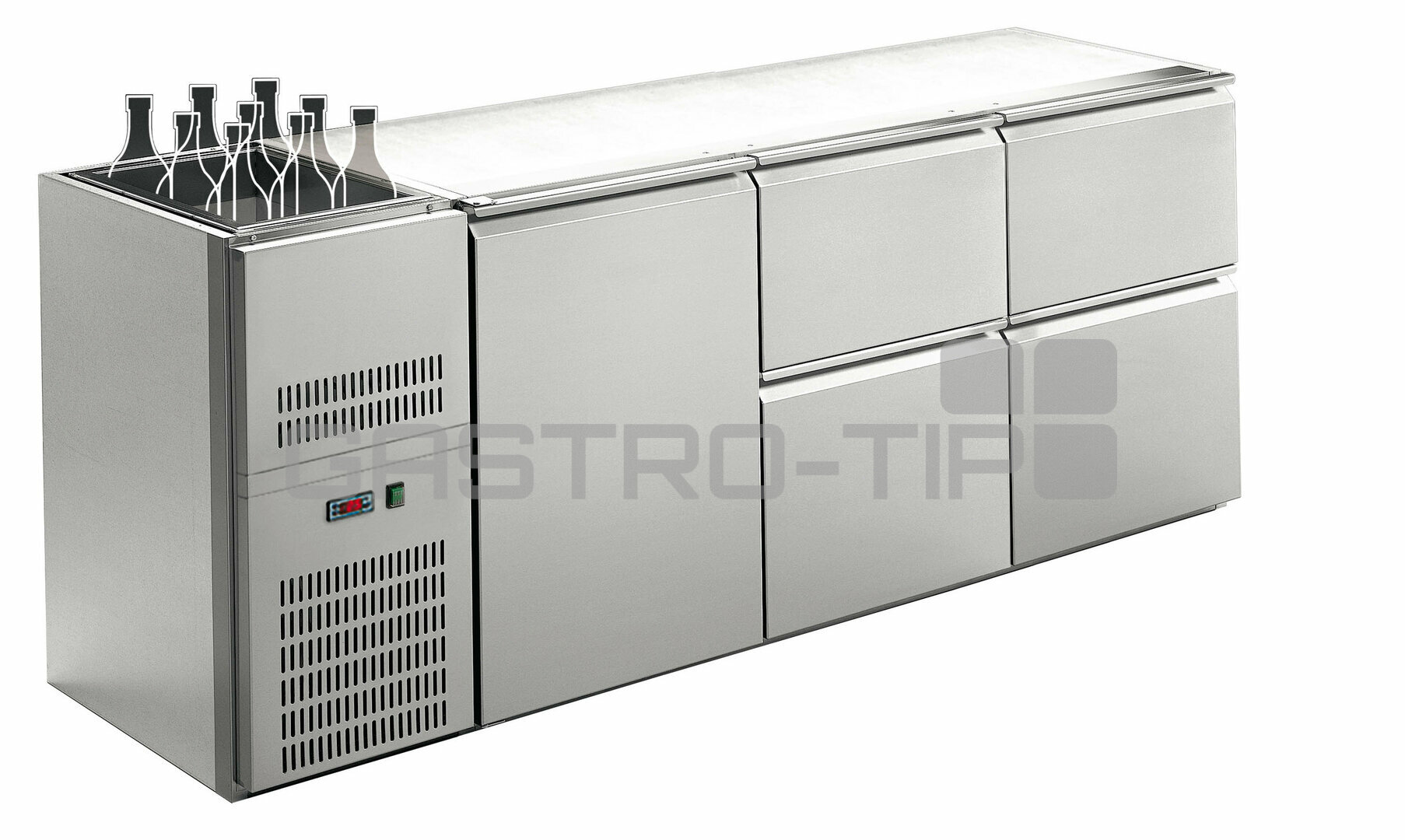 Třísekcový barový chladící stůl. Model v celonerezovém provedení (AISI 304), s chlazenou vanou (312x515xh250) nad agregátem (vpravo/vlevo). Digitální ovládání, ventilované chlazení, aut.odtávání (připojení na odpad). Stoly ve standardu dodávány bez v...