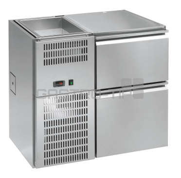 Chladicí barové stoly s chlazenou vanou nad agregátem REGD / REGS-110E, 102E, 220E, 212E a 204 E jsou určeny pro vestavění pod barovou desku (V základu se zákrytem a krycím rámečkem chlazené vany - bez pracovní desky!), jsou vyrobeny v celonerezovém provedení (AISI 304) s vestavěným agregátem, který je dle verze umístěn vpravo nebo vlevo. Digitální ovládání teploty společné pro chlazený prostor a vanu (příplatkově - STC - individuální ovládání teploty vany). Ventilované chlazení, automatické odtávání (připojení na odpad). Vybaveny hlubokými zásuvkami pro nápoje, nebo s dvířky (prostor pro Keg sud).