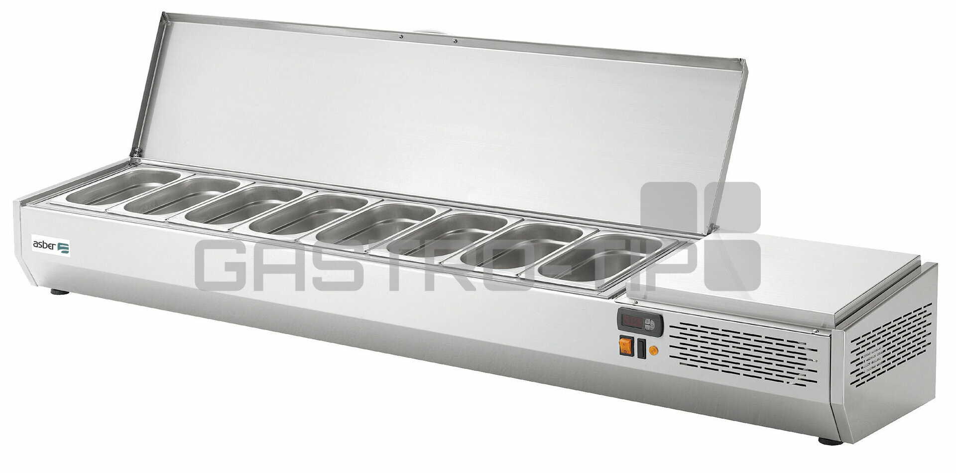 Chladící pizza nástavba ASBER GVL (dříve EVL) v celonerezovém provedení s vrchním nerezovým krycím víkem (sklopným s fixací v otevřeném stavu) určena nejenom pro pizza chladící stoly ASBER. Speciálně vyrobena z vysoce kvalitní nerezové oceli pro náročné profesionální provozy, vyznačující se velmi robustním designem a dokonalým zpracováním, odtok vody speciálně navržený pro snadné čistění. Vitríny se statickým chlazením a vestavěnou jednotkou jsou určeny pro uchovávání chlazených ingrediencí pro přípravu pizzy, salátů, sendvičů a dalších pokrmů v nerezových GN nádobách (velikost dle modelu GN1/4, nebo GN1/3) s hloubkou maximálně 150mm. Intuitivní digitální ovládání (snadné nastavení teploty a parametrů), teplotní rozsah od +2°C do +8°C, klimatická třída IV, světelné tlačítko start-stop, ekologický chladicí plyn: R600 Hydrofluorouhlík (HC), napájecí napětí: 230V1N/50 Hz.