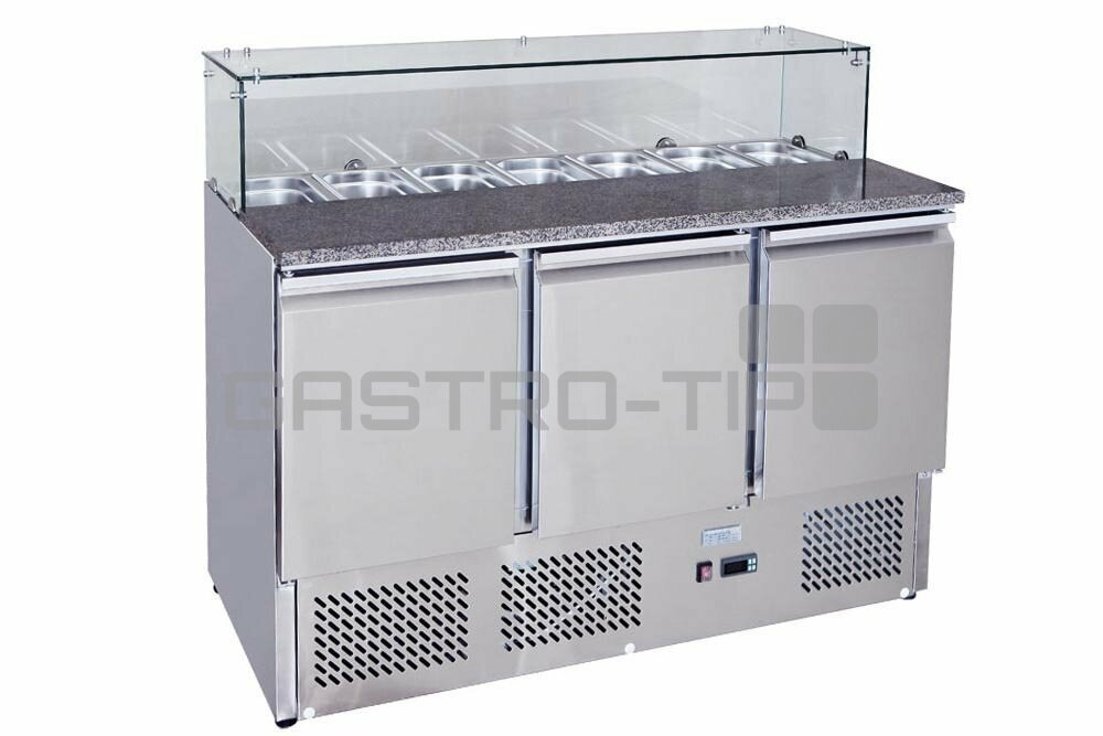 Celonerezové provedení s plnými dveřmi, vrchní prosklený hygienický zákryt (odnímatelný) a žulová pracovní deska. Vnitřní roštová police GN1/1 (1x ve dveřích). Vrchní deska je tvořena z poloviny žulovou pracovní deskou a v zadní části stolu je chlazený otvor pro vložení GN1/3 s ingrediencemi (vychlazovány ze spodní částí chlazeného stolu, GN nejsouv ceně).