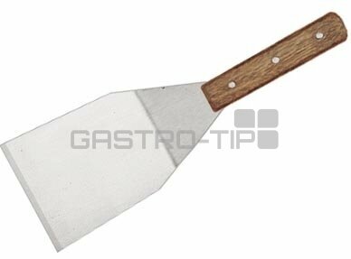 Masivní široká nerezová obracečka s dřevěnou nýtovanou rukojetí.