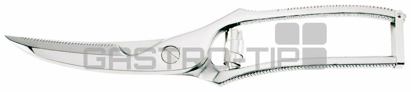 Velké stabilní nerezové nůžky na kuřata a další drůbež. Nástroj má zdrsněnou rukojeť a malé zoubky na ostří pro snadné zpracování masa.