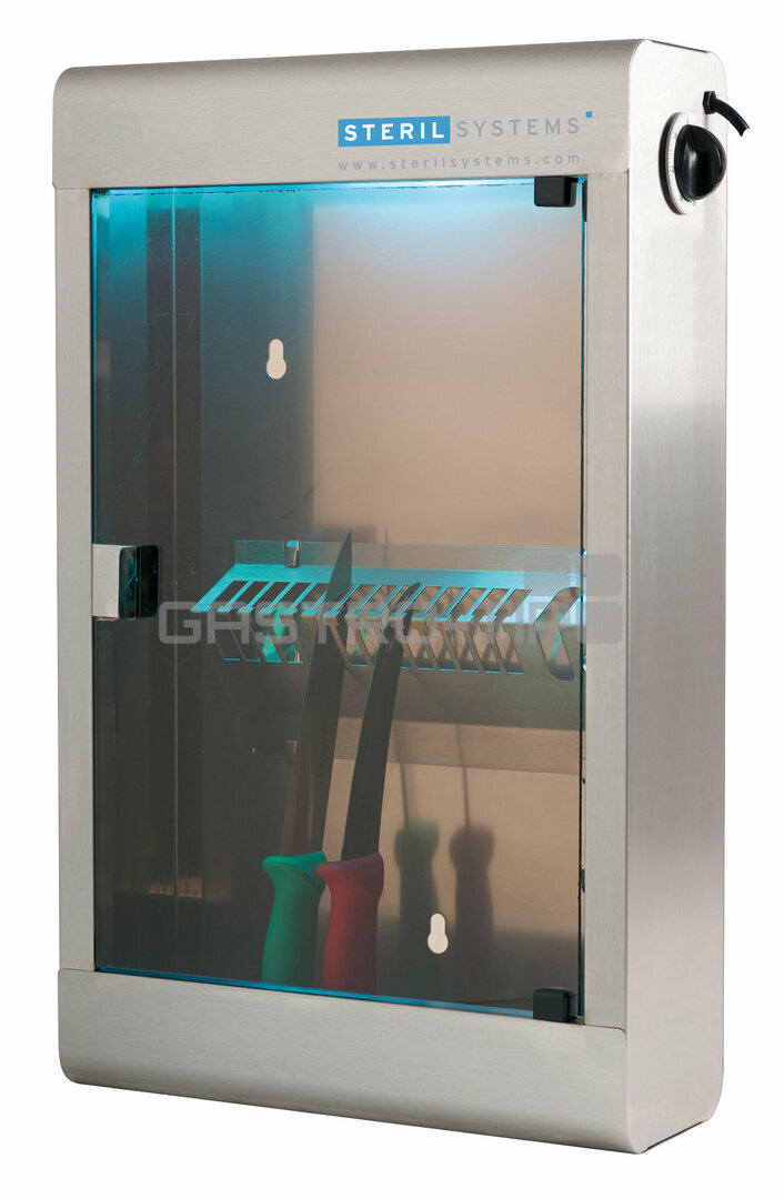 Pro účinnou sterilizaci nožů pomocí UV – C záření. Efektivně a s minimální spotřebou energie sterilizuje povrch nožů a jeho využití je možné ve všech oblastech potravinářství a laboratořích. Účinnost sterilizace od nežádoucích zárodků, virů, kvasinek a spor plísní je 99,99%. Nože se po umytí vloží do přístroje a časový spínač se nastaví na 0-120 min. Po uplynutí ca. 60-90 min. jsou nože vydesinfikované.