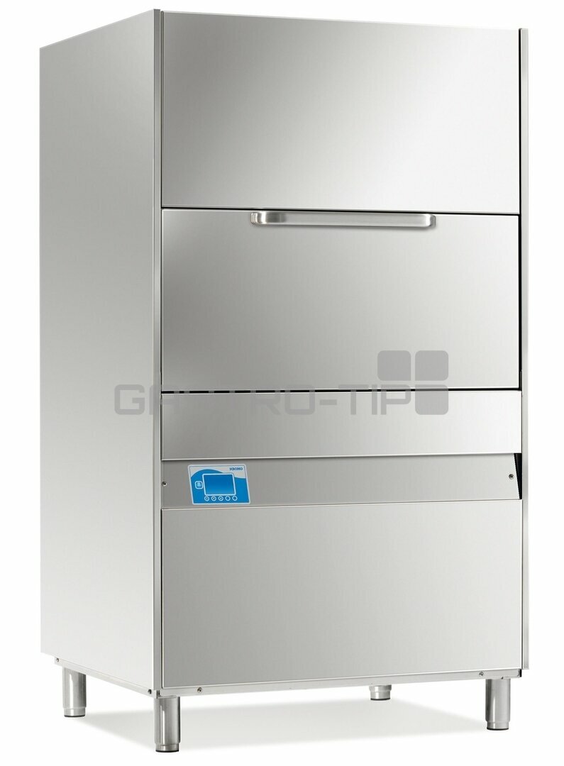 nadstandardně vysokým nádobím. Koš 850 x 725 mm, přídavný stojan na 8 plechů umožňuje mýt GN 1/1 a GN 2/1, pekařské plechy EN 600 x 400 mm, hrnce, pánve, podnosy