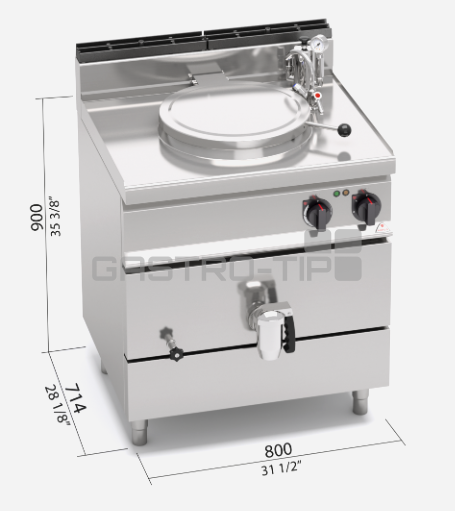vyrobena z nerez oceli AISI 316 o tloušťce 15/10 se zesíleným dnem 20/10. Ovládání výkonu nebo regulace teploty pomocí termostatu. Kotle jsou vybaveny baterií s napuštěcím raménkem a bezpečnostním výpustným kohoutem 1 1/2”.